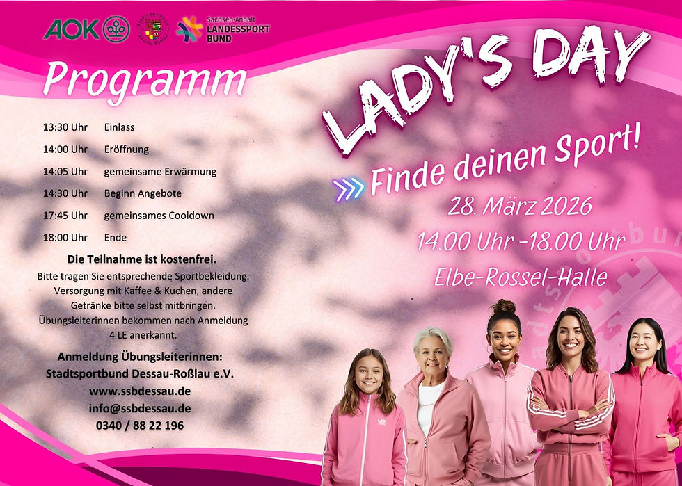Der Stadtsportbund Dessau-Roßlau e.V. hat für den 28.03.2026 wieder ein sportliches Programm für alle Mädchen und Frauen, die Lust haben gemeinsam Sport zu treiben, vorbereitet.
